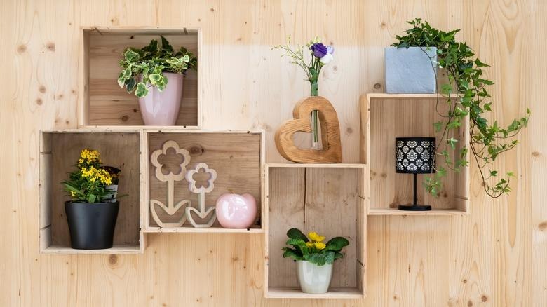 I used wooden crates and mounted them on the wall. They add a slightly rustic look and give you deeper storage compared to flat shelves.